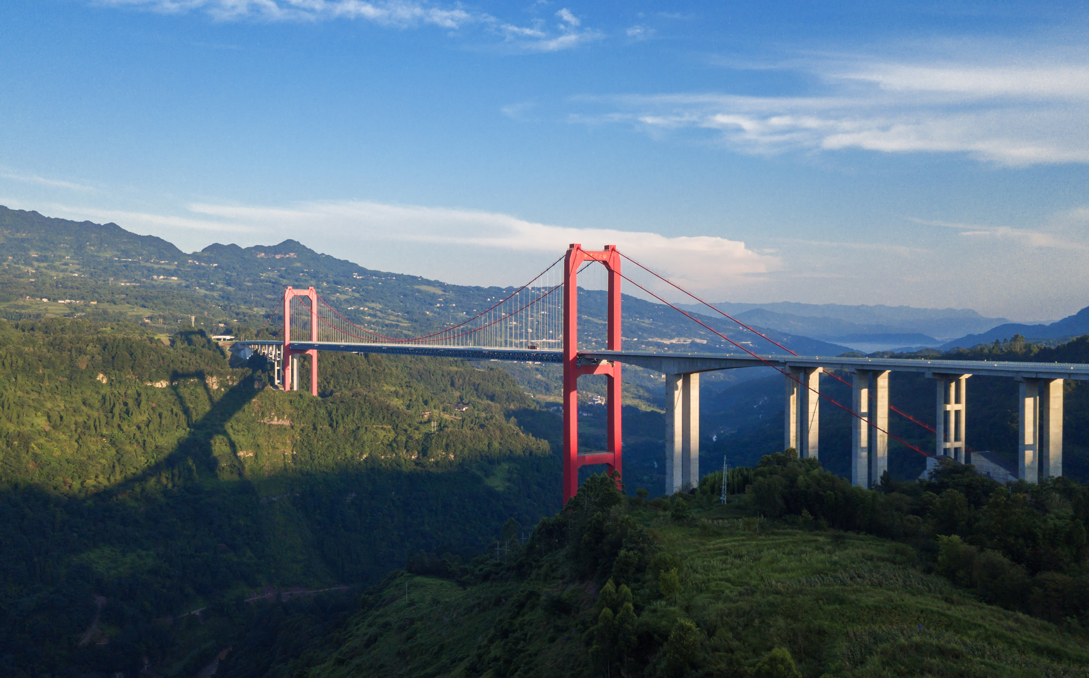 筍溪河大橋橋梁全長(zhǎng)1578米,主橋?yàn)?60m鋼桁加勁梁懸索橋,橋面寬24.5米,最大索塔高190.65米,橋面距河谷達(dá)290米,是重慶市第一高橋,重慶市首座山區(qū)大跨度懸索橋、最大跨度鋼桁加勁梁懸索橋。大橋于2015年7月1日開(kāi)工建設(shè),2018年6月29日建成通車,2019年獲得“中國(guó)鋼結(jié)構(gòu)金獎(jiǎng)”榮譽(yù)。