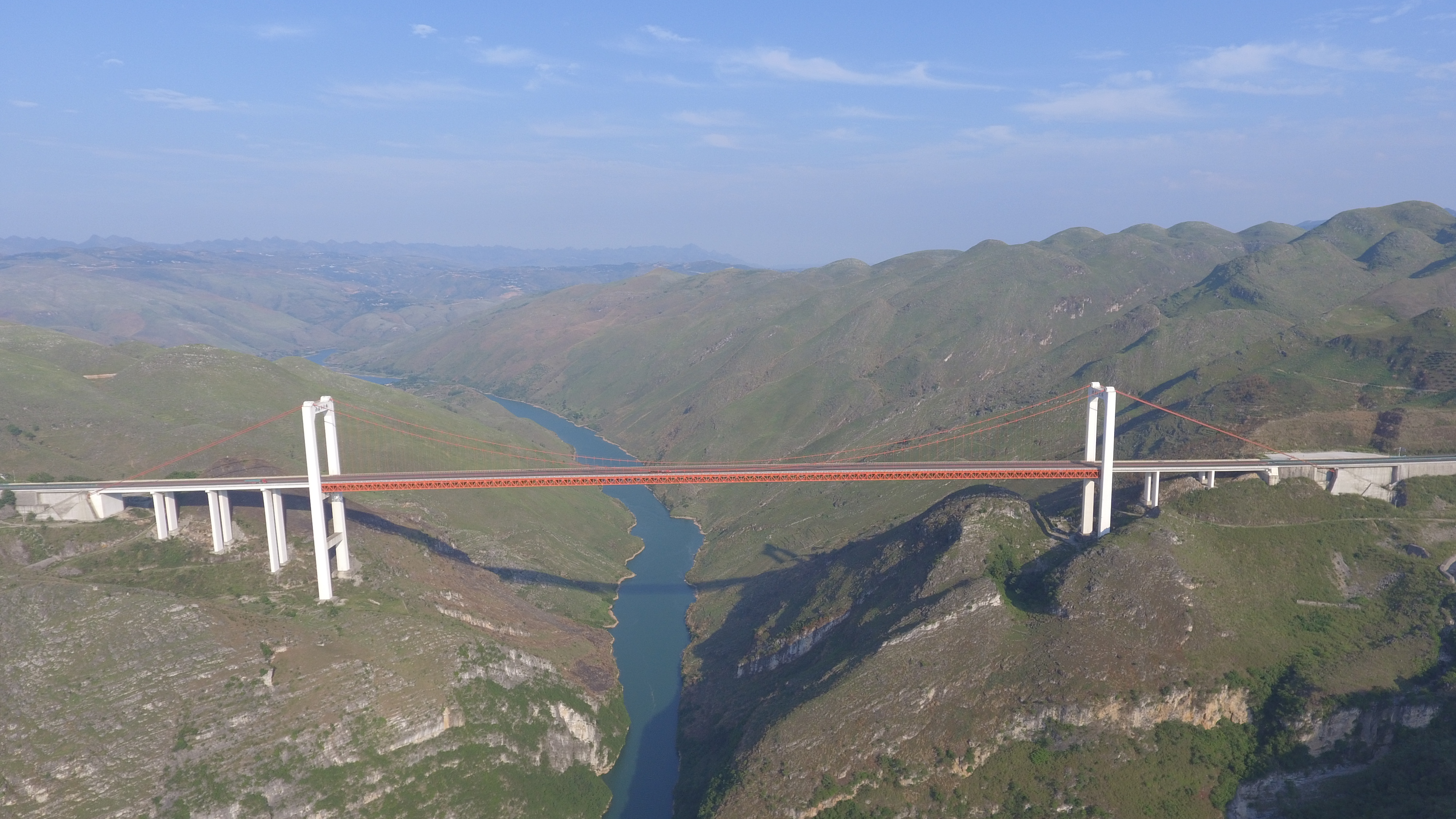 鎮(zhèn)勝高速公路北盤江特大橋,其主跨為636m單跨雙鉸鋼桁加勁梁懸索橋。主梁和橋面板安裝均采用纜索吊裝施工工藝,160T吊重和636m吊跨在建設(shè)時為國內(nèi)之最,指引了千米級纜吊的設(shè)計與施工。大橋于2009年12月23日建成通車。